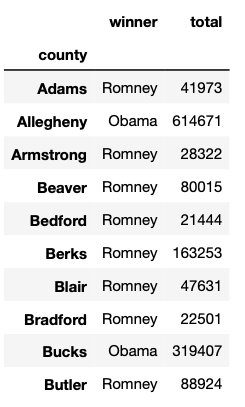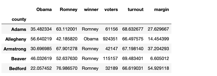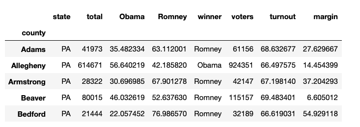 Adams        PA   41973  35.482334  63.112001  Romney   61156  68.632677